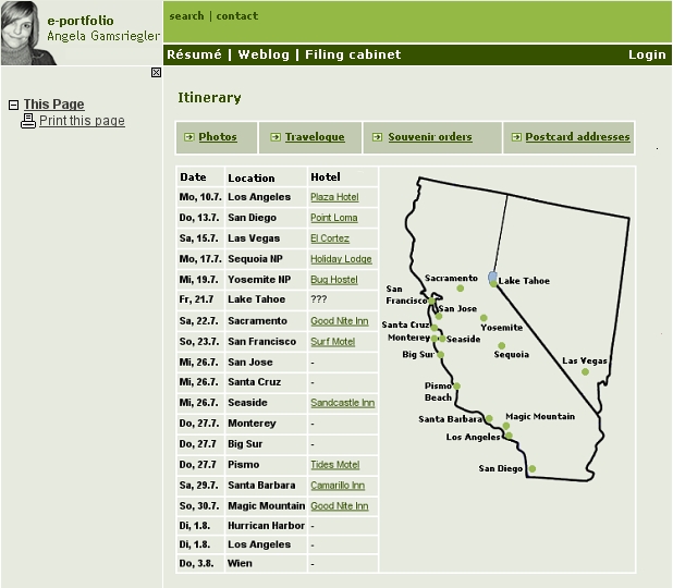 I do not use my e-portfolio solely for studying or for professional purposes. In July 2006, I traveled through California. In order to plan the trip, I created a detailed itinerary. The itinerary contains links to accommodations, popular sights as well as important documents (e.g. copy of passport, car rental agreement,...).